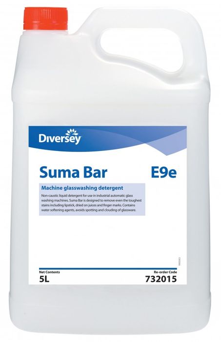Non-caustic liquid detergent for use in industrial automatic glass washing machine. Suma Bar is designed to remove even the toughest stains including lipstick, dried on juices and finger marks. Contains water softening agents, avoids spotting and clouding of glassware.