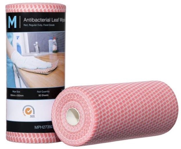 Antibacterial leaf wipes are hygenic and highly absorbent and food grade. Dispensed on a perforated roll for convenience, they are reusable and machine washable. These wipes are made from a regular duty 50gsm, 70% viscose, 30% polyester mix.