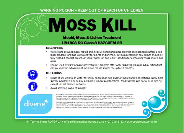 Will kill and prevent moss, mould and mildew, lichen and algae growing on most hard surfaces. It is biodegradable and has low toxicity for plants and animals. But as a precaution any foliage should be fully rinsed if contact occurs. An ideal "Spray-on and leave" solution for controlling moss, mould and algae